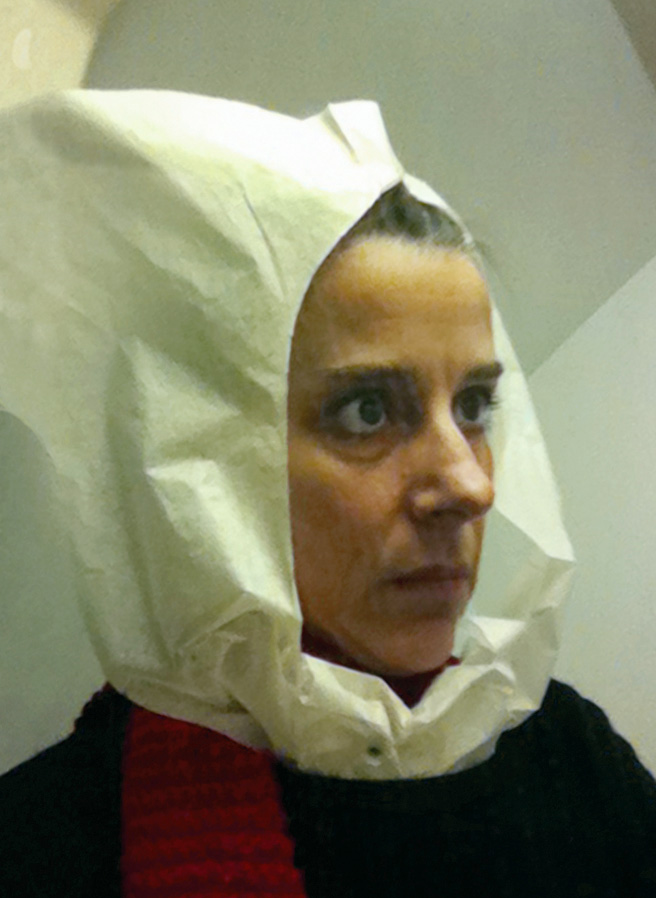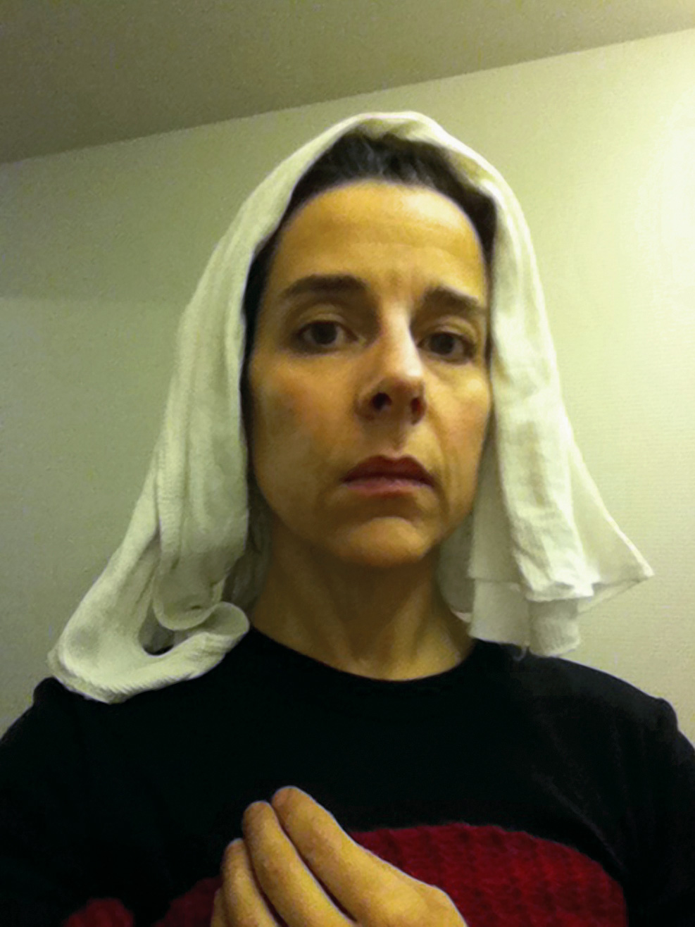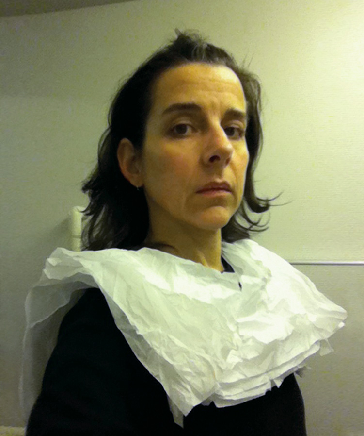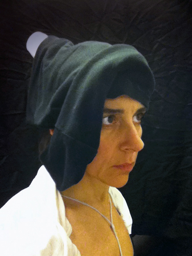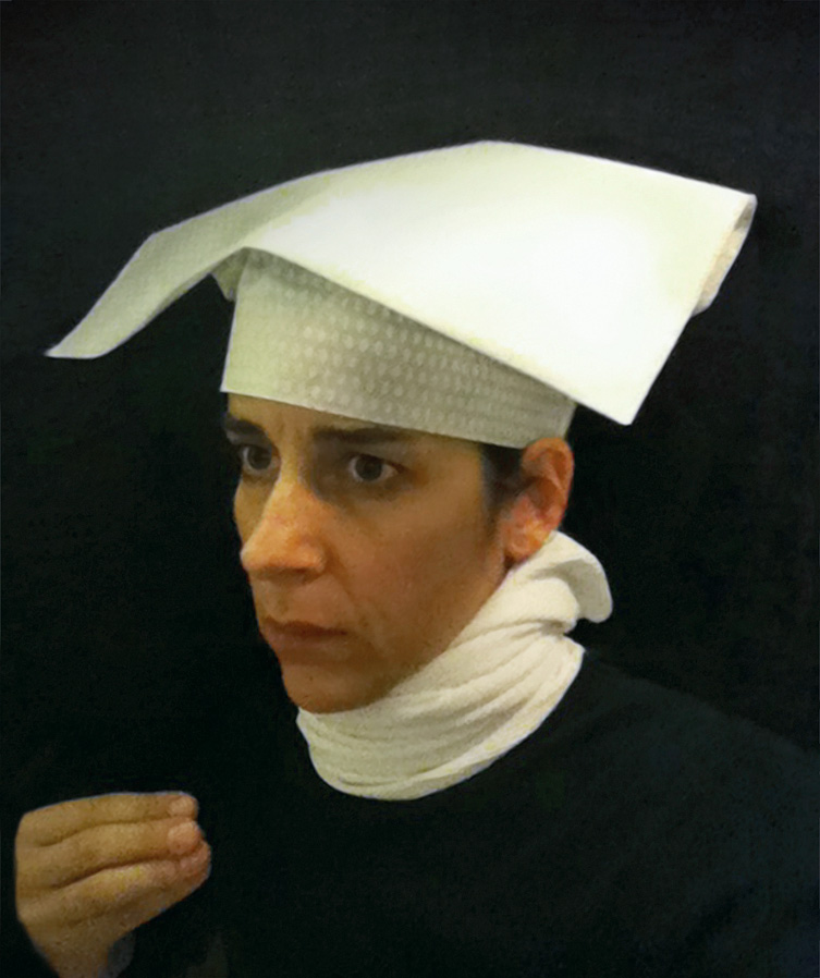 While in the lavatory on a domestic flight in January 2011, I spontaneously put a tissue paper toilet cover seat cover over my head and took a picture in the mirror using my cellphone. The image evoked 15th-century Flemish portraiture. I decided to add more images made in this mode and planned to take advantage of a long-haul flight from San Francisco to Auckland, guessing that there were likely to be long periods of time when no one was using the lavatory on the 14-hour flight. I made several forays to the bathroom from my aisle seat, and by the time we landed I had a large group of new photographs entitled Lavatory Self-Portraits in the Flemish Style. I was wearing a thin black scarf that I sometimes hung up on the wall behind me to create the deep black ground that is typical of these portraits. There is no special illumination in use other than the lavatory's own lights and all the images are shot hand-held with the camera phone. At the Dunedin Public Art gallery, the photos were framed in faux-historical frames and hung on a deep red wall reminiscent of the painting galleries in museums like the Metropolitan Museum of Art.