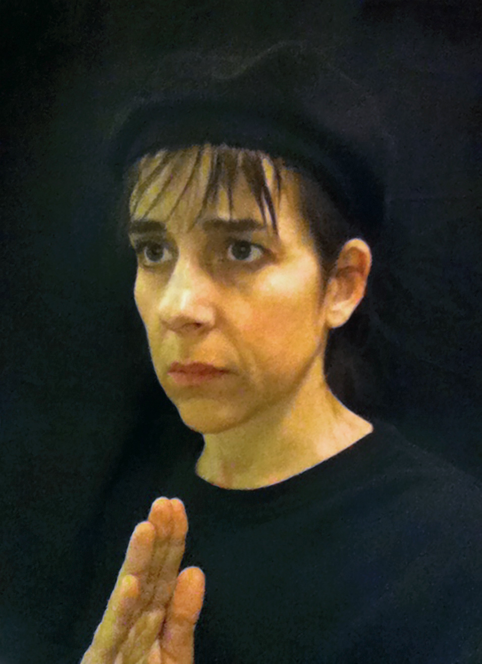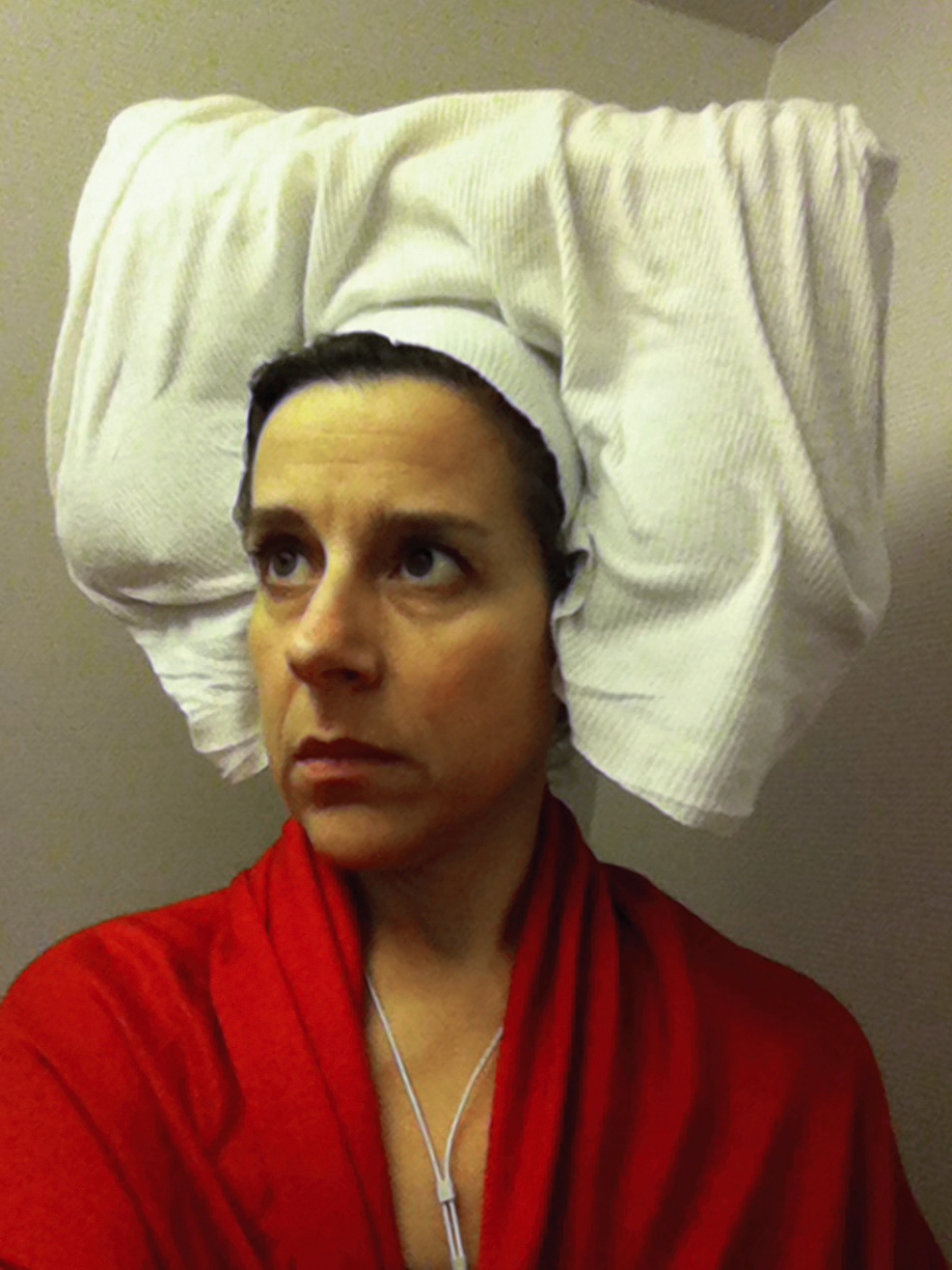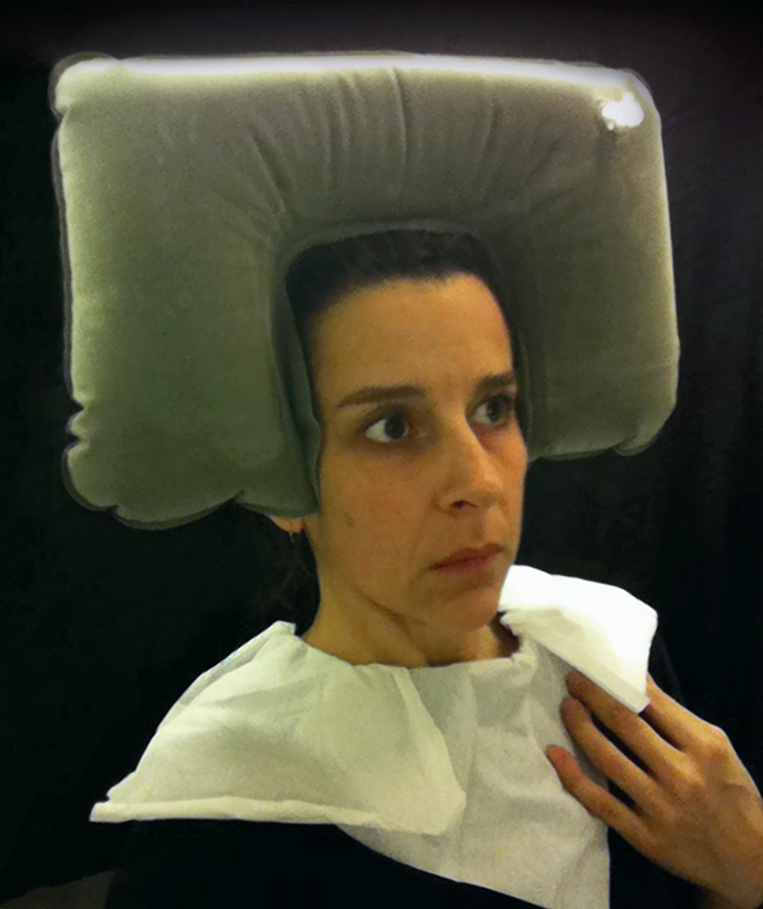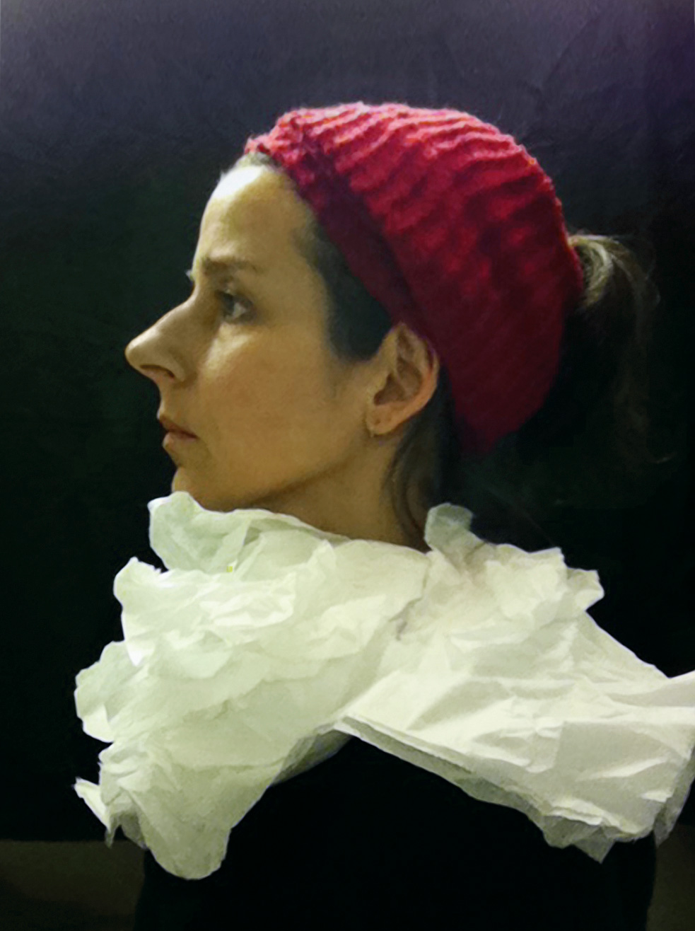 While in the lavatory on a domestic flight in January 2011, I spontaneously put a tissue paper toilet cover seat cover over my head and took a picture in the mirror using my cellphone. The image evoked 15th-century Flemish portraiture. I decided to add more images made in this mode and planned to take advantage of a long-haul flight from San Francisco to Auckland, guessing that there were likely to be long periods of time when no one was using the lavatory on the 14-hour flight. I made several forays to the bathroom from my aisle seat, and by the time we landed I had a large group of new photographs entitled Lavatory Self-Portraits in the Flemish Style. I was wearing a thin black scarf that I sometimes hung up on the wall behind me to create the deep black ground that is typical of these portraits. There is no special illumination in use other than the lavatory's own lights and all the images are shot hand-held with the camera phone. At the Dunedin Public Art gallery, the photos were framed in faux-historical frames and hung on a deep red wall reminiscent of the painting galleries in museums like the Metropolitan Museum of Art.